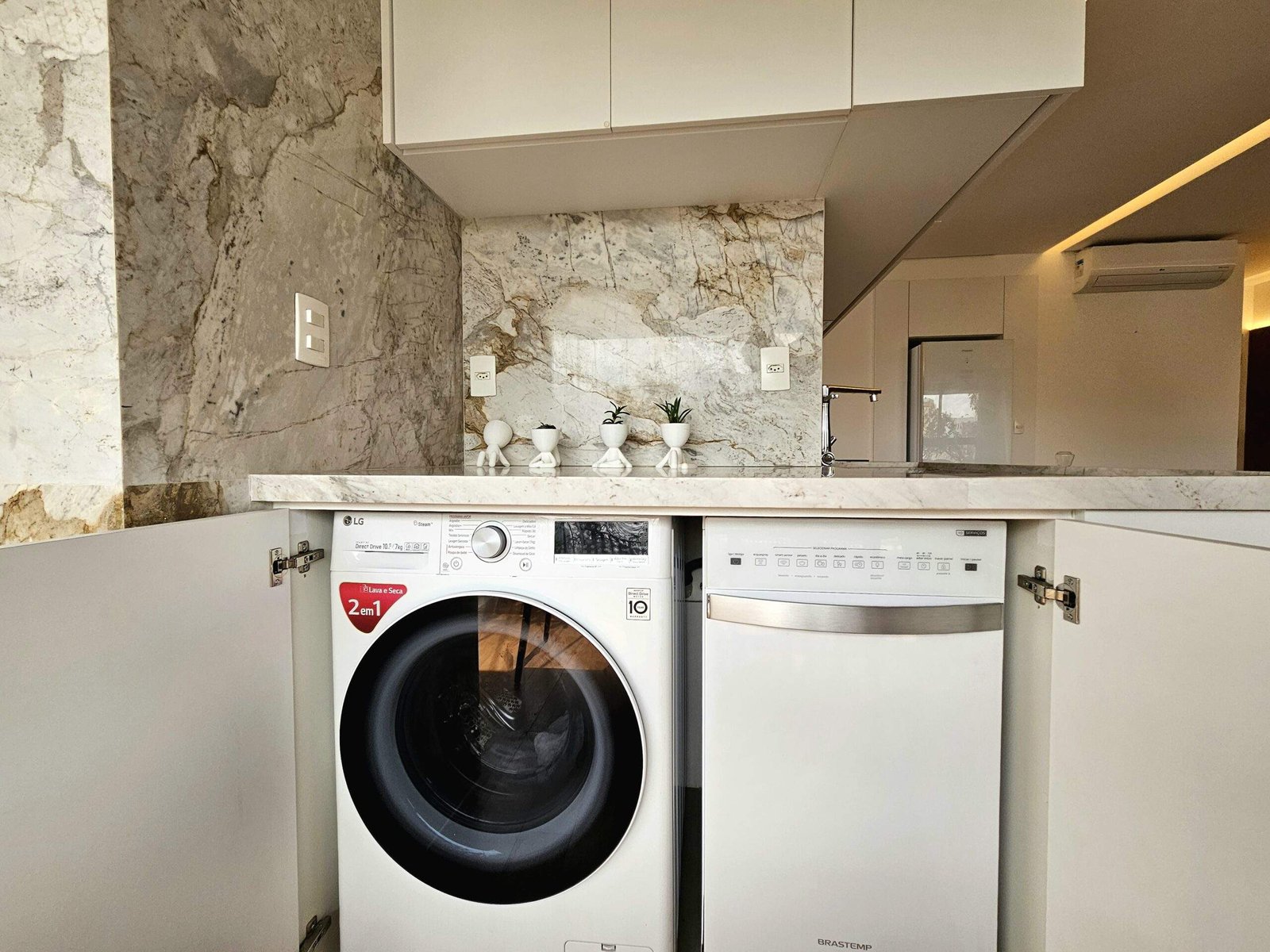 Eletrodomésticos completos: lava-louças, lava e seca, cooktop de indução, forno com dupla função (forno e micro-ondas)