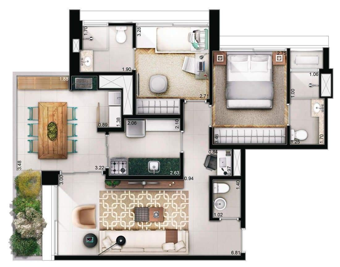 Possui varanda integrada à sala, cozinha aberta para o living, lavabo e duas suítes.