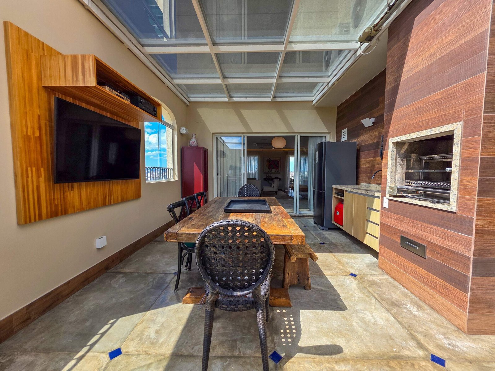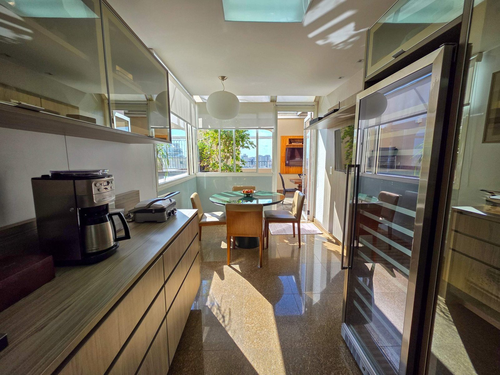 A sala de almoço conecta-se à varanda gourmet e a área da piscina.
