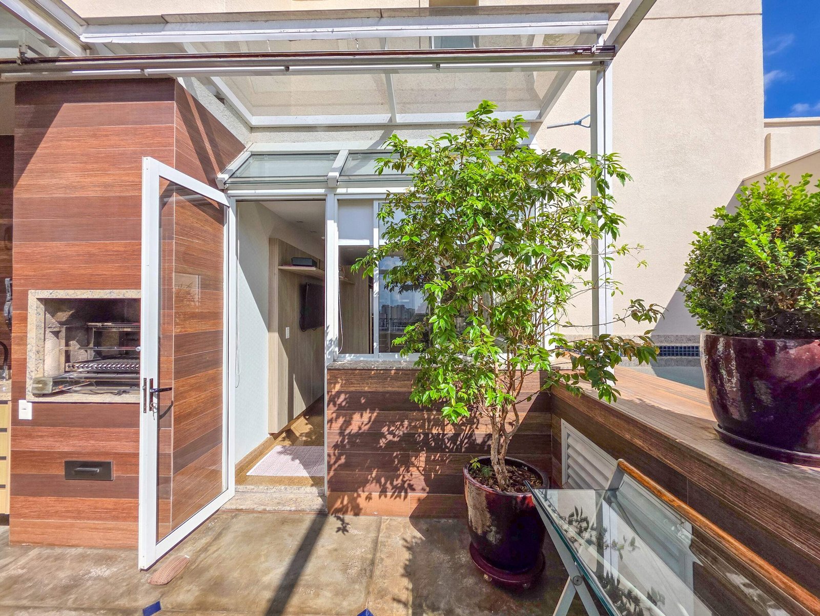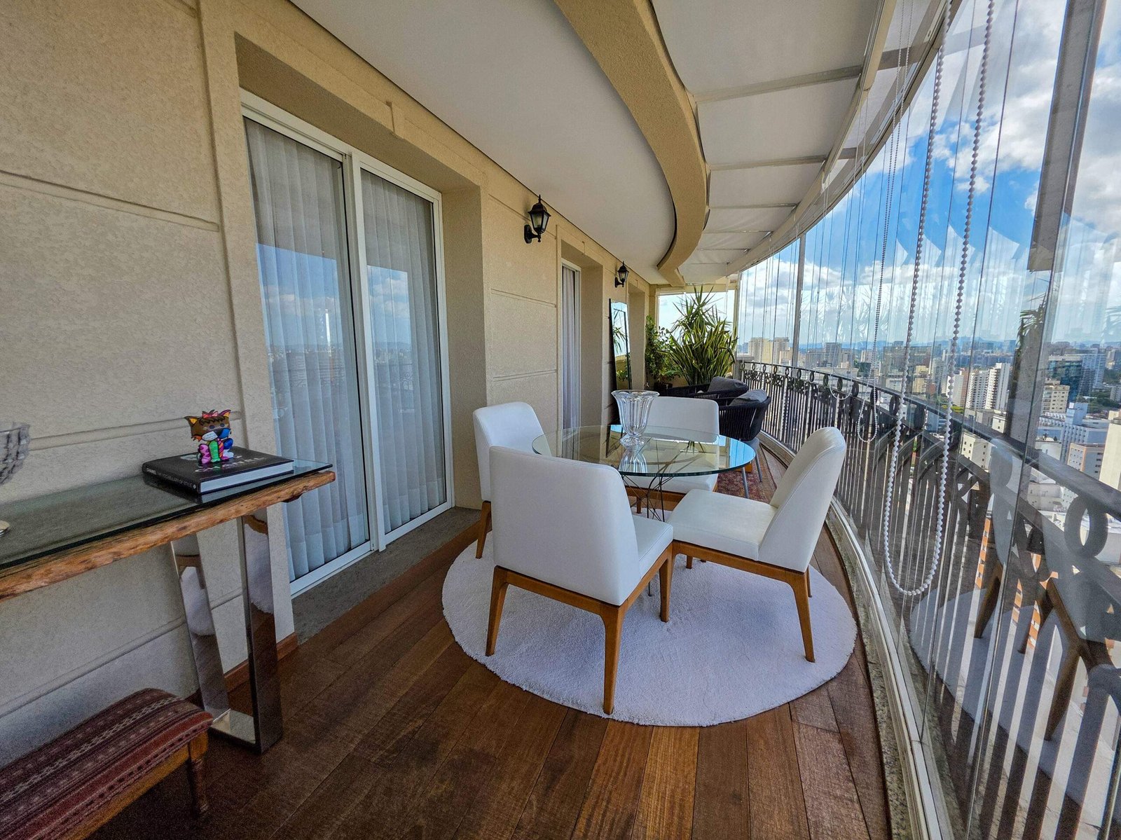 A cobertura oferece um living para até quatro ambientes, lareira, varanda frontal com vista aberta e área externa com piscina e varanda gourmet com teto retrátil e piso em cimento queimado.