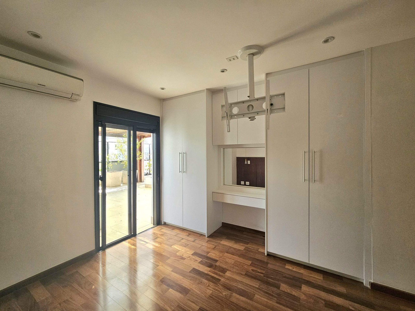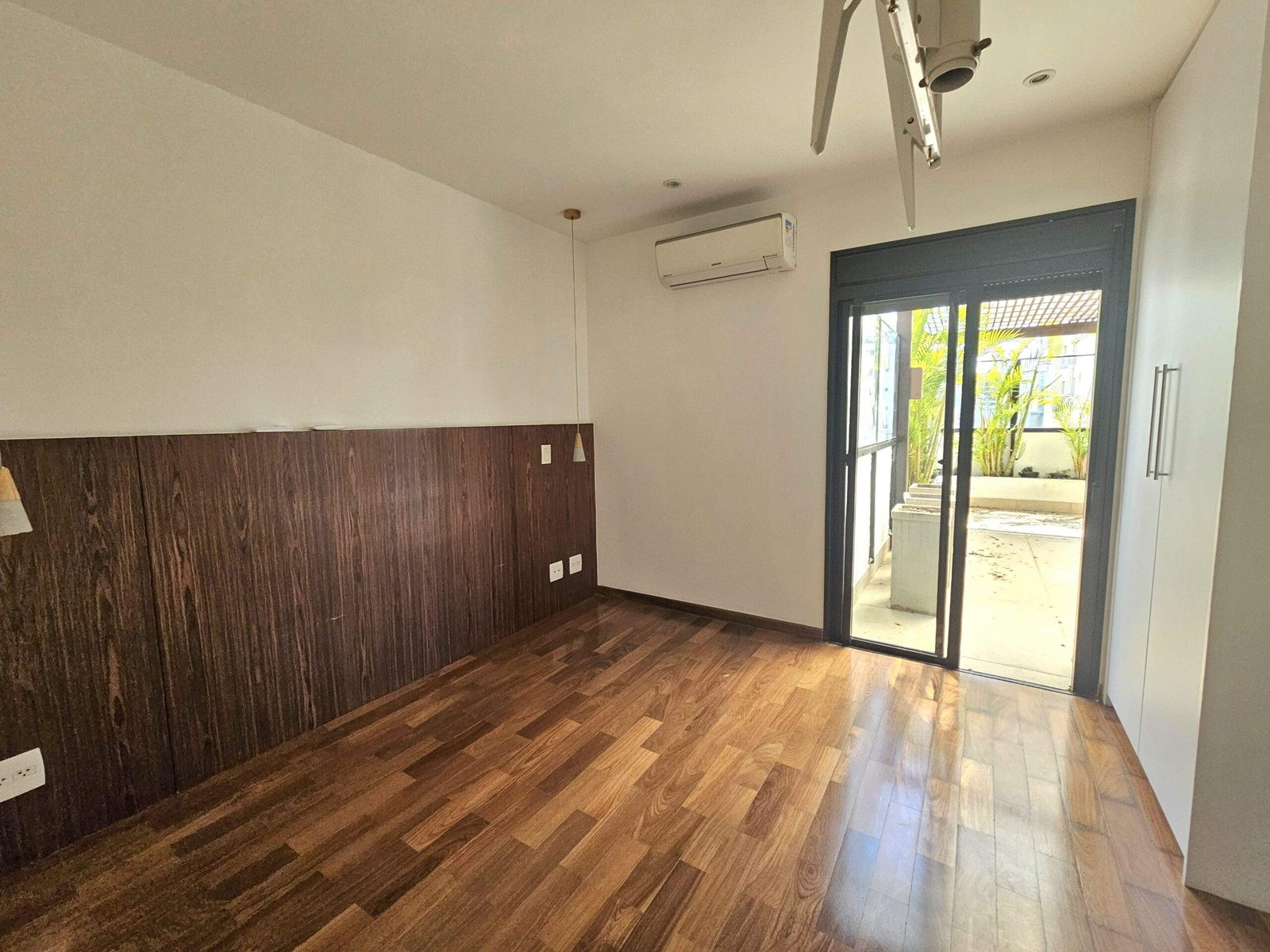 A suíte master é generosa, comporta cama king size, tem muitos armários, closet e acesso à varanda.